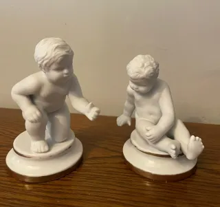 Conjunto de dos figuras de niños porcelana biscuit con detalles dorados. La base se mide 7cm y de alto 12cm. Peso: las dos 420gr. - Base circular con borde dorado.