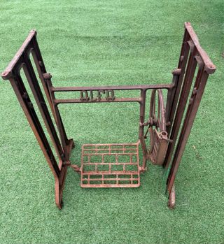 Base de hierro para máquina de coser Alfa. Un elemento clásico para tu taller. - Diseño robusto y duradero. - Incluye pedal. - Rueda lateral.