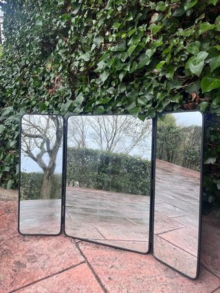 Elegante espejo triptico con marco. - Diseño moderno y funcional. - Tres paneles para una visión completa. No se puede cerrar, se mantiene como esta. Tiene un pequeño golpe de 2 cm, vean foto. Medidas: 71cm alt. 25-50-25cm ancho