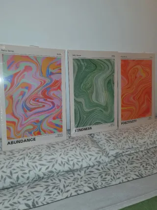 Conjunto de tres cuadros decorativos con un diseño abstracto y moderno. Perfectos para añadir un toque de color y estilo a cualquier espacio. - Diseño tipo mármol en tonos vibrantes. - Cada cuadro tiene un título inspirador: Abundance, Kindness, Positivity. - Formato vertical.