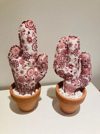 Este par de cactus decorativos añaden un toque encantador a cualquier espacio. Están hechos de tela con un bonito estampado floral. - Diseño de cactus. - Estampado floral en tonos rosas y blancos. - Macetas de terracota incluidas. - Relleno de pequeñas piedras blancas en las macetas.