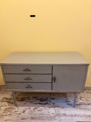 Mueble aparador de madera pintada en gris con un diseño moderno y funcional. Sus dimensiones son 101,5 cm de ancho, 40 cm de profundidad y 71,5 cm de alto. - Tres cajones con tiradores metálicos. - Puerta lateral con tirador.