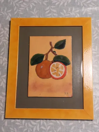 Bonito cuadro decorativo de cerámica hecho a mano con un diseño de frutas. - Marco de madera a medida. - Pieza única: las frutas están pintadas a mano con esmalte sobre cobre tratado. - Tamaño: alto: 33cm. Ancho: 27cm. -1 : 10€. -Los 2: 15€.