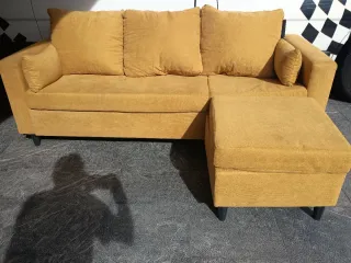 Cómodo sofá chaise longue con un diseño moderno. - Tapicería de tela. - Color amarillo vibrante. - Incluye cojines. - Patas negras.