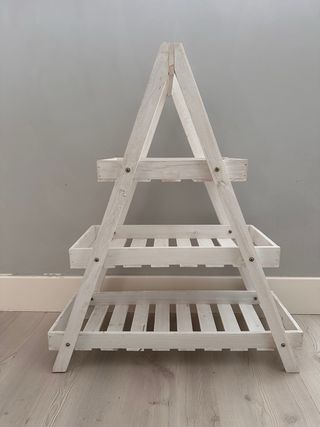 Estructura de madera de tres niveles, ideal para exhibir plantas o cualquier objeto decorativo. Su diseño en forma de A le da un toque rústico y moderno. - Fabricado en madera. - Color blanco desgastado.