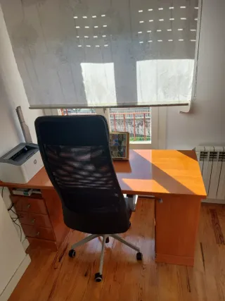 Escritorio de madera maciza con un acabado pulido. - Diseño robusto y elegante. - Amplia superficie de trabajo. - 3 cajones. - 1 puerta con baldas. (Tiene unos pequeños roces del uso, reparables)