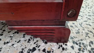Mueble de madera maciza con un diseño clásico y elegante. - Acabado en tono oscuro. - Cajones con tiradores. - Estantes amplios para almacenamiento.