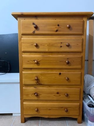 Cómoda de madera con un diseño rústico y elegante. Sus cajones ofrecen un amplio espacio de almacenamiento. - Tiradores metálicos. - Acabado en tono miel. - Patas con diseño clásico.