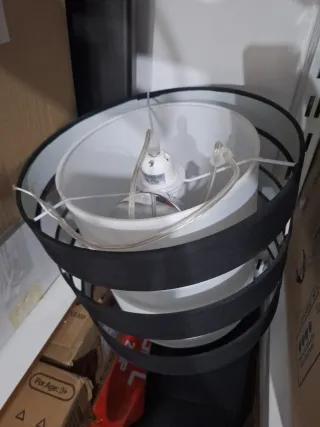 Elegante lámpara de techo con un diseño contemporáneo que combina blanco y negro. Su estructura metálica y detalles en tela le dan un toque sofisticado. - Diseño de tres aros. - Base cónica. - Cable de alimentación.