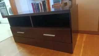Mueble auxiliar de salón o para TV. Práctico, clásico y funcional. Cuenta con espacio de almacenamiento abierto y dos cajones con tiradores metálicos. - Compartimento abierto superior. Tiene una mancha dentro de uno de los cajones. Recogida en mi domicilio o en zaragoza