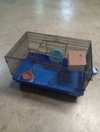 Jaula para hámster con accesorios. - Incluye rueda. - Bebedero. - Comedero. - Plataforma. - Bandeja azul.
