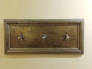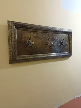 Elegante perchero de pared con un diseño decorativo. Posibilidad de vender con espejo de 150 x 80cm a juego (105€) - Marco con detalles ornamentales. - Tres ganchos metálicos.