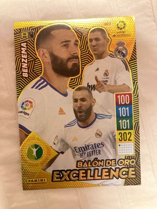 Carta de Karim Benzema, edición Balón de Oro Excellence de Adrenalyn. - Incluye estadísticas de 100, 101, 101 y 302. - Diseño dorado con imágenes del jugador. - Logotipos de LaLiga Santander y Real Madrid.