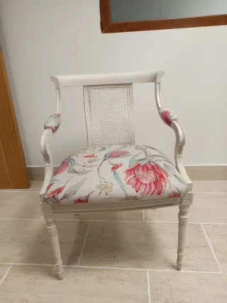 Precioso conjunto de 4 sillas de gran calidad, restauradas y tapizadas a mano. Estructura de madera maciza con respaldo de rejilla natural y brazos curvos de estilo clásico. Han sido pintadas con pintura chalk paint en tono crema y tapizadas con tela decorativa de inspiración floral, lo que les da un estilo elegante y muy acogedor. Perfectas para comedor, salón o como sillas decorativas. Son sillas robustas y muy cómodas, con un diseño atemporal que combina tanto con decoración clásica como moderna. ✔ Restauradas recientemente ✔ Tapizado nuevo ✔ Madera maciza de gran calidad Se venden juntas (340€) o por separado (85€).