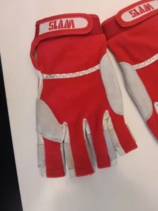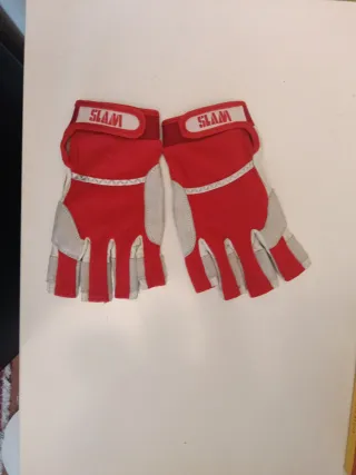 Guantes de navegación de vela en talla L. Son de color rojo y gris. - Cierre de velcro. - Diseño sin dedos.