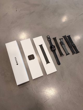 Reloj inteligente Apple Watch SE de 44mm en color gris espacial. Incluye caja original y varias correas. - Caja original incluida. - Múltiples correas de repuesto.