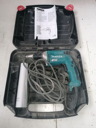 Atornillador eléctrico Makita FS4200, ideal para pladur. Potencia: 570W / 4000rpm. Permite ajustar el cabezal para regular según la longitud del tornillo. Se incluye maletín y el manual de instrucciones.