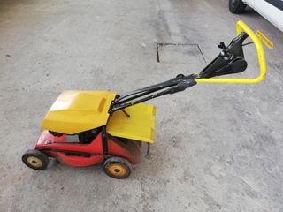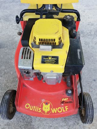 Cortacésped de gasolina Outlis Wolf mod. Pat 46. - Motor Suzuki de 4T. - Regulación mediante palancas en manillar de la tracción y la velocidad. - Con palanca en chasis para regular la altura de corte. - Tapa superior para proteger la mecánica. Sin cubeta de recogida puesto que tritura la hierba y no es necesario recogerla. Arranca y para perfectamente, pero lleva un tiempo parado por lo que es posible que necesite una pequeña puesta a punto. Robusto y capaz, en llano y en pendiente.