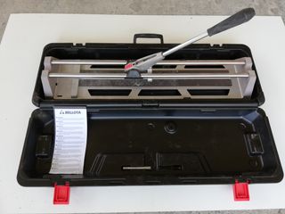 Cortadora de azulejo Bellota POP 50-C en su maletín. Máxima robustez y precisión de corte. Base de aluminio inyectado extra ancha para una mayor superficie de apoyo de la baldosa. Guías de corte de acero cromado. Para cortes rectos hasta 53cm, cortes en diagonal 38 x 38 cm y espesor hasta 12 mm. Medidas: 680 x 170 x 90 mm. Peso: 4,15 kg. - Maletín de transporte incluido. - Mango ergonómico para un mejor agarre. Con manual de instrucciones y su caja original. Se ha usado 1 sola vez. Está nueva, como si fuera de estreno...