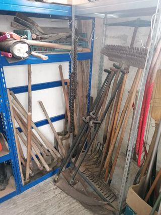 Lote grande de herramientas de mano para trabajos de jardinería o campo. Hay hachas, hachucos, palas, picos, rastrillos, hoz, martillos, martilletes, porras... - Con mango de madera a 20€/ud. - Sin mango a 10€/ud. - Utensilios robustos para diversas tareas. Hago precio por cantidad.