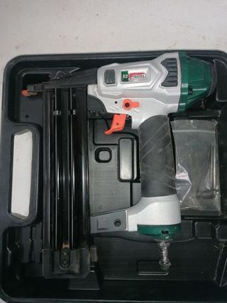 Clavadora Neumática profesional Fasten 50-18RN. - Para clavo de 1,2mm y Largo de 10 hasta 50 mm. - Tipo de clavo con cabeza. - Carro de Aluminio de gran resistencia con apertura. - Pieza de contacto de goma para evitar marcas. - Maletín incluído. Regalo caja con varias tiras de clavos. Se ha usado únicamente para colocar 30m2 de suelo. Está como nueva. Peso 1,37 kg. - Incluye manual de uso. - Caja de clavos. - Aceitera. - Llave Allen.