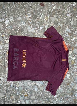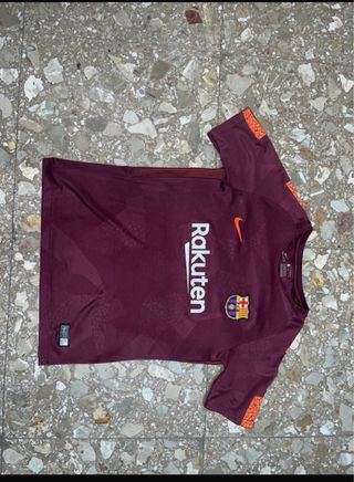 Camiseta de fútbol del FC Barcelona de la temporada 2017/2018, talla infantil. Presenta el escudo del club y el patrocinador. - Color granate con detalles naranjas. - Diseño con patrón gráfico. - Logo de Nike y escudo del FC Barcelona.