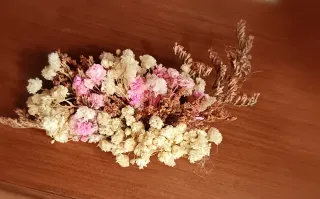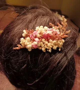 Preciosa pinza adornada con flores secas de paniculata. Ideal para complementar un peinado. - Flores de paniculata en tonos blancos y rosados. - Adorno floral delicado.