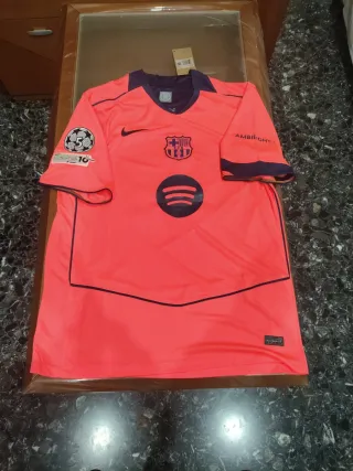 Camiseta de fútbol del FC Barcelona. - Diseño en color naranja vibrante. - Logo de Nike en el pecho. - Escudo del FC Barcelona. - Patrocinador Spotify. - Detalle AMBILIGHT en la manga. - Parche FOUNDATION 10 YEARS en la manga.