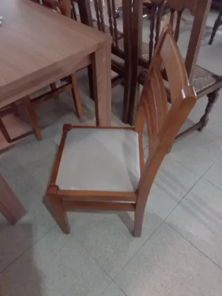 Conjunto de mesa de comedor con cuatro sillas. - Mesa con superficie de madera. - Sillas con asiento de tela y estructura de madera Verlo en BRAVEHEART Rastro, calle transport 67, muro de Alcoy Abrir miércoles, jueves, y viernes 10 de 14 Sábado y domingo 10 de 14
