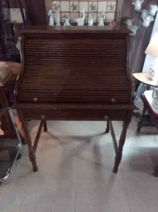 Elegante escritorio de madera con un diseño clásico y funcional. Perfecto para tu espacio de trabajo o estudio. - Mecanismo de persiana para ocultar el área de trabajo. - Cajón inferior para almacenamiento adicional. Verlo en BRAVEHEART Rastro, calle transport 67, muro de Alcoy Abrir miércoles, jueves y viernes 10 de 14 Sábado y domingo 10 de 14