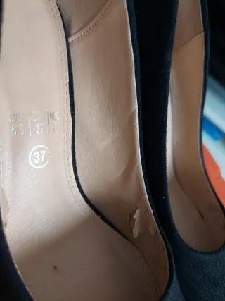 Zapatos de tacón en color negro. - Diseño de punta fina. - Tacón grueso y robusto. - Material de ante. - Tacon 9 cm La polipiel de dentro está cuarteada pero se quita y queda la tela como en el talón. Por fuera están bien.