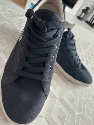 Zapatillas de la marca Fred Perry en color azul marino. Detalle de franjas blancas y azules en el talón. Logo de laurel bordado en blanco en el lateral.
