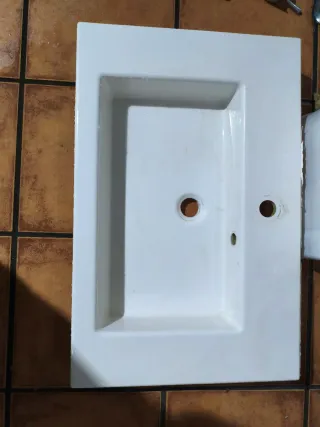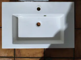 Pila de lavabo de cerámica blanca, de 70 cm. - Diseño rectangular con borde. - Dos orificios para grifería y desagüe.