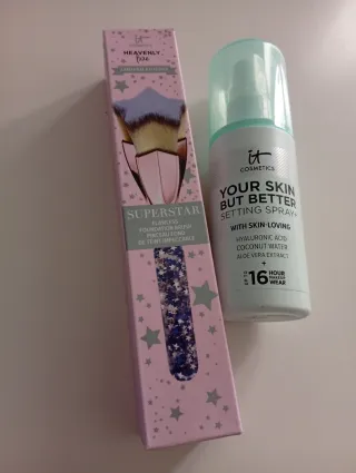 Set de maquillaje IT Cosmetics. - Cepillo Heavenly Luxe Superstar para base de maquillaje. -Spray fijador Your Skin But Better Setting Spray.