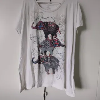 Camiseta blanca con un diseño llamativo de elefantes apilados. - Estampado de elefantes en tonos multicolor. - Detalles brillantes y ornamentales. - Cuello redondo con adornos.