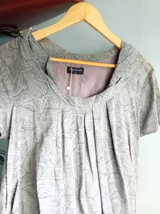 Vestido con un bonito estampado en tonos grises y beige. Su diseño es elegante y cómodo. - Escote drapeado. - Mangas cortas. - Detalle de fruncido lateral.
