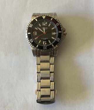 Reloj Casio MTD 1053 con un diseño tipo diver deportivo y elegante. - Bisel giratorio unidireccional. - Resistencia al agua de 200 metros. - Correa de acero inoxidable. - Esfera analógica con marcadores luminosos.
