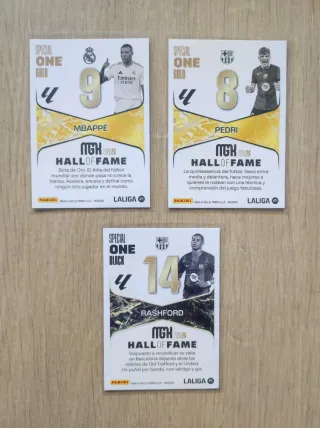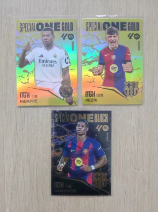 Lote de 3 cromos de fútbol: Special One Gold de Pedri y Mbappé, y Special One Black de Rashford. Edición 2025/26. - Cromo Special One Gold de Kylian Mbappé. - Cromo Special One Gold de Pedri. - Cromo Special One Black de Marcus Rashford. - Diseño holográfico y detalles dorados/negros. - Incluye logos de EA Sports y Panini. Megacracks 2025-26 MGK. También tengo cromos de: Leo Messi, Jamal Musiala, Pedri, Gavi, Xabi, Mbappe, Haaland, Lebron James, MGK, Lamine Yamal 108bis, Liga este 19bis, #423 megacracks.