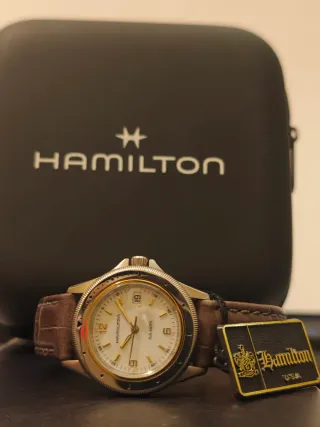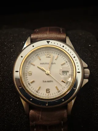 Hamilton Sub 660ft, pre-Khaki, original de la década de 1980, prácticamente nuevo, con etiqueta y estuche de viaje. Diámetro con corona de 33mm. Bisel de acero unidireccional de 60 clics con bisel interior chapado en oro. Fecha a las 3 en punto con lupa. Puntos y agujas luminiscentes. El reloj se encuentra en un estado espectacular y en perfecto estado de funcionamiento. No presenta marcas ni arañazos en la caja ni en el cristal. Corona atornillada con logotipo. Un reloj con un marcado carácter deportivo, pero absolutamente adecuado para el uso diario, dada la elegancia. Correa de cuero.