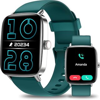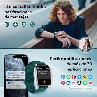 Reloj inteligente con un diseño moderno y versátil. - Correa de silicona en color verde. - Caja metálica en tono plateado.