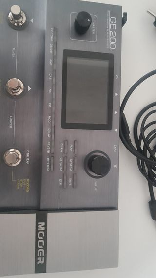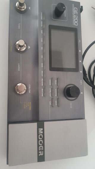 Pedal multiefectos Mooer GE200 con pantalla. - Controles de master, value y selector. - Botones de función: play, system, save, chain, ctrl/tap, exp. - Botones de efectos: fx/comp, os/od, amp, cab, ns, eq, mod, delay, reverb, rhythm. - Botones de looper y tuner. - Botones de record, dub, stop, clear.