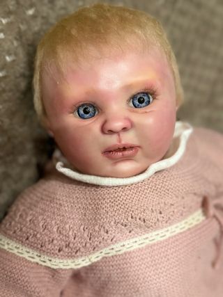 Preciosa muñeca bebé reborn con detalles realistas. - Pelo rubio. - Ojos azules. - Vestido de punto rosa. Es antigua