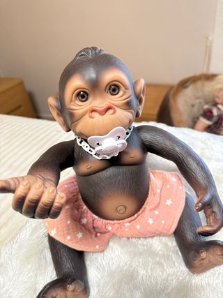 Figura de monito de vinilo con un diseño tierno y detallado. Viene con un collar blanco y un chupete. - Material: Vinilo. - Incluye collar y chupete.