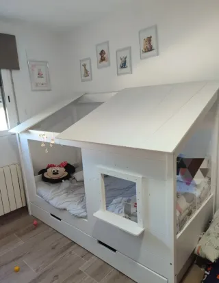 Cama con diseño de cabaña, ideal para habitaciones infantiles. Nueva costó 600 euros. El cajón no está en buen estado de ahí su precio (PRECIO NEGOCIABLE) - Diseño de casa con techo. - Ventana. - Cajones inferiores.