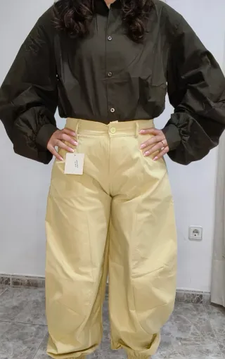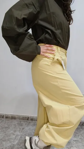 Conjunto de dos piezas para mujer. - Camisa de manga larga en color marrón - Pantalón de tiro alto en color amarillo Vandible separado también.