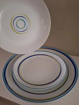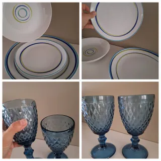 Conjunto de vajilla completo para 6 comensales, con un diseño moderno y elegante compuesto por 6 platos planos, 6 hondos y 6 de postre. Las copas son de cristal duro. - Platos de cerámica con detalles en azul y verde. - Copas de cristal azul con relieve. - Ideal para uso diario o ocasiones especiales.