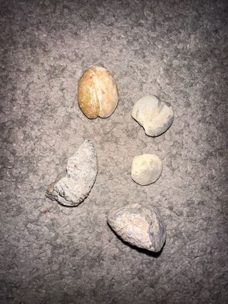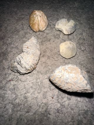Conjunto de cinco fósiles de diferentes formas y texturas. -Braquiopodos y fráfmentos de Bivalvo - Piezas únicas. - Ideal para coleccionistas.
