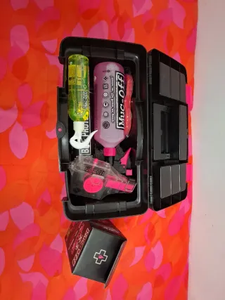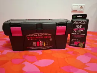 Kit de limpieza Muc-Off para bicicletas, modelo Ultimate Bicycle Care Kit. Incluye una caja organizadora. - Caja de almacenamiento - Incluye varios productos y accesorios para el cuidado de la bicicleta: diferentes tipos de cepillo, lubricante, limpiador de transmisión, limpiador específico, spray protector. Precio en tienda: 120€ Muchos de los productos están sin utilizar, incluso con etiqueta.