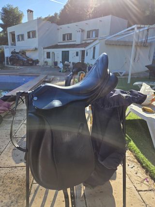 Prácticamente nueva. Montura de doma clásica marca Zaldi New Kent en color negro. - Talla 18 '' (44 cm) - Latiguillos en V - Lleva su funda original - Bastes de fábrica - Asiento profundo - Faldones rectos - Material: Piel. Se ha utilizado poco. Las manchas que se observan en las fotos son de limpieza y engrasado recientes. Opcionalmente, CINCHA con cámara de aire y ESTRIBOS de seguridad ( + 200€) Año 2023. Precio original: 1.500 € 📍 Náquera / Serra / zona de Valencia - Chiva