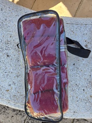 Conjunto de vendajes para caballos en color burdeos y blancos, guardados en una bolsa con asa original. Se venden juntos o separados. En buen estado. Poco uso. - Material de los vendajes: tela. - Color: burdeos. - Incluye bolsa de almacenamiento transparente.